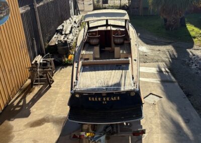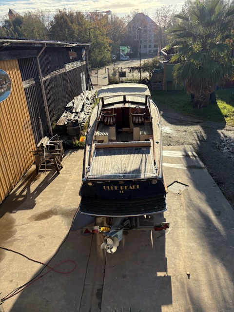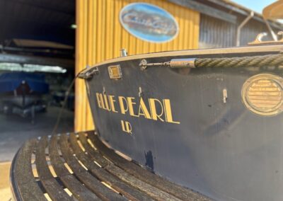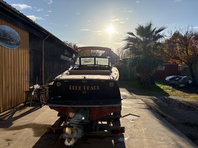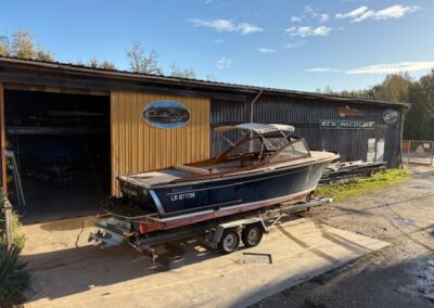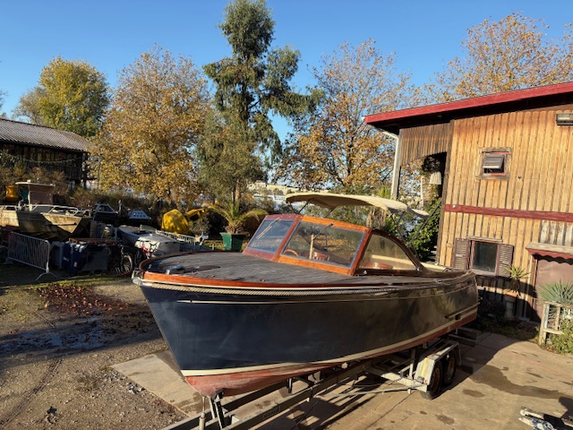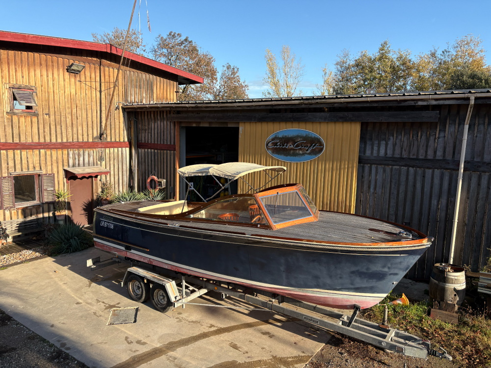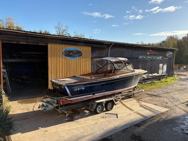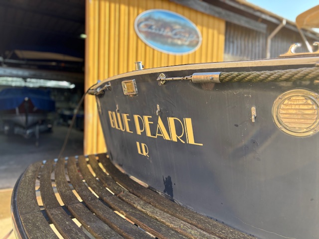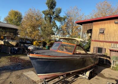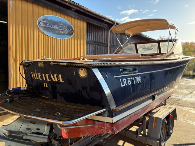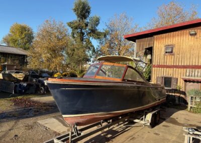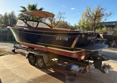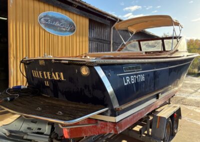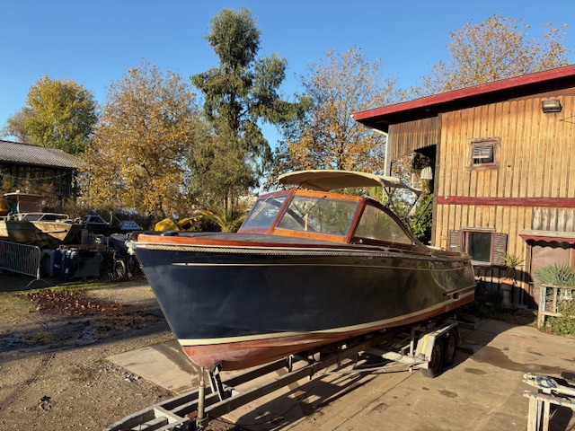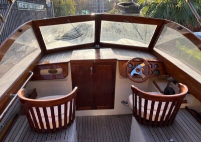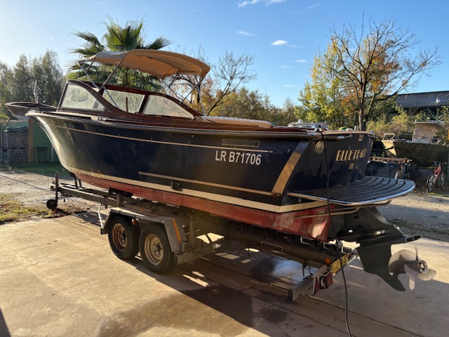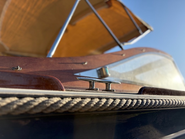 Sa coque bleu marine, sa tonture élégante, son pare-brise anguleux ceinturé d’acajou verni et son tableau arrière frégaté lui confèrent une silhouette intemporelle et unique sur le marché.